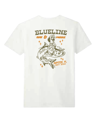 The Blueline Cowgirl Tarpon T-Shirt in Washed Natural features a western-inspired graphic of a cowgirl riding a tarpon in Jupiter, FL. Soft, lightweight, and perfect for anglers, beach days, and anyone who loves unique Florida artwork with coastal style. A standout Blueline design with a vintage western twist. One of our favorite designs combing our passions.