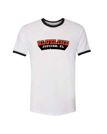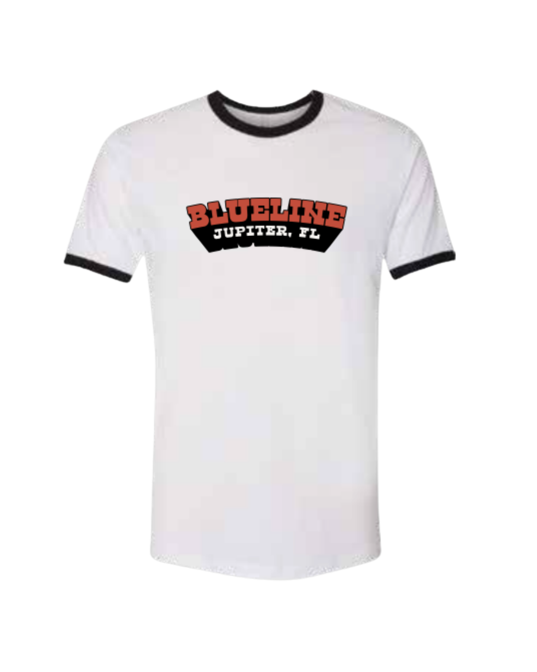 Blueline Ringer T-Shirt White/Black with retro Jupiter FL logo – front view Blueline Ringer T-Shirt White/Black with retro Jupiter FL logo – front view