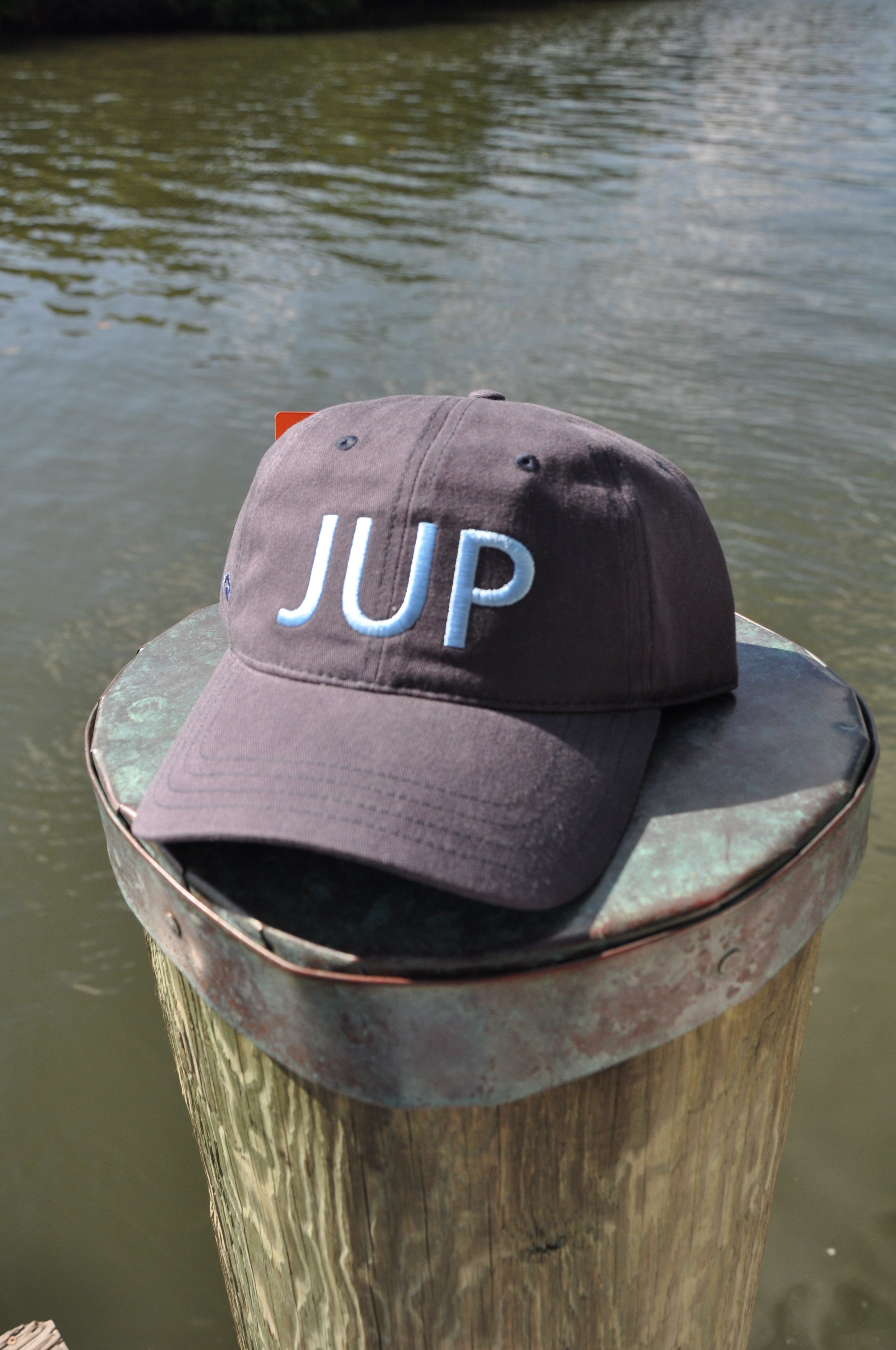 JUP Cotton Twill Hat Navy/Carolina with bold JUP lettering on dock in Jupiter Florida JUP Cotton Twill Hat Navy/Carolina with bold JUP lettering on dock in Jupiter Florida