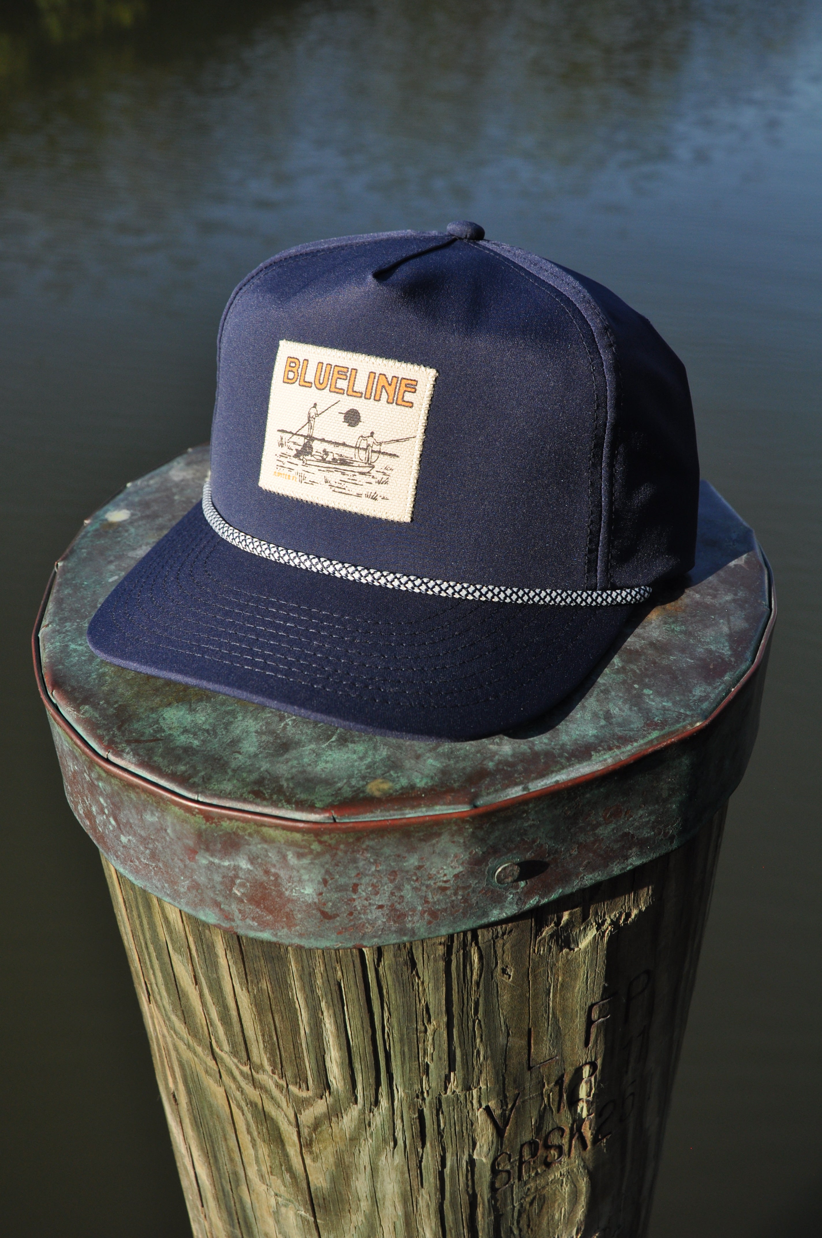 The Skiff Hat in twilight navy features a structured profile, classic rope detail across the bill, and a vintage-inspired Blueline patch front.