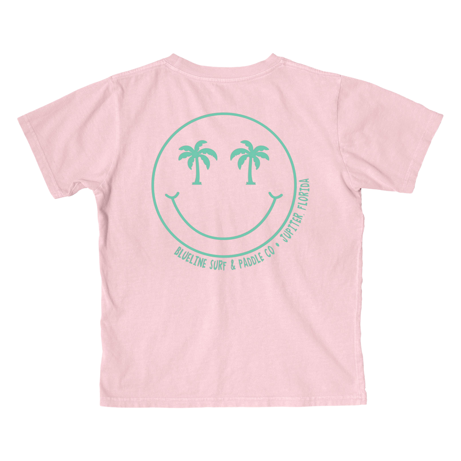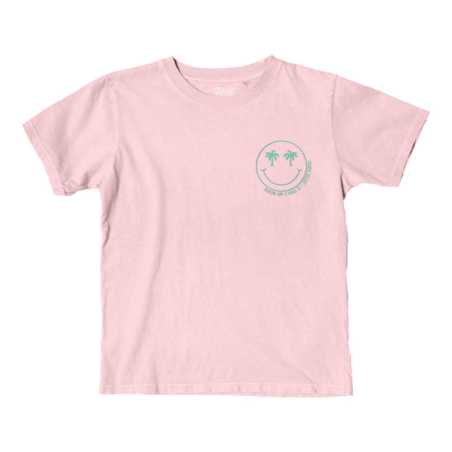 The Youth Blueline x Blue 84 Tee Hee T-Shirt in Blush. This soft, lightweight kids’ tee features our playful smiley palm design, perfect for beach days, boat rides, and all the fun that comes with growing up in Jupiter, FL or wherever you call home.
