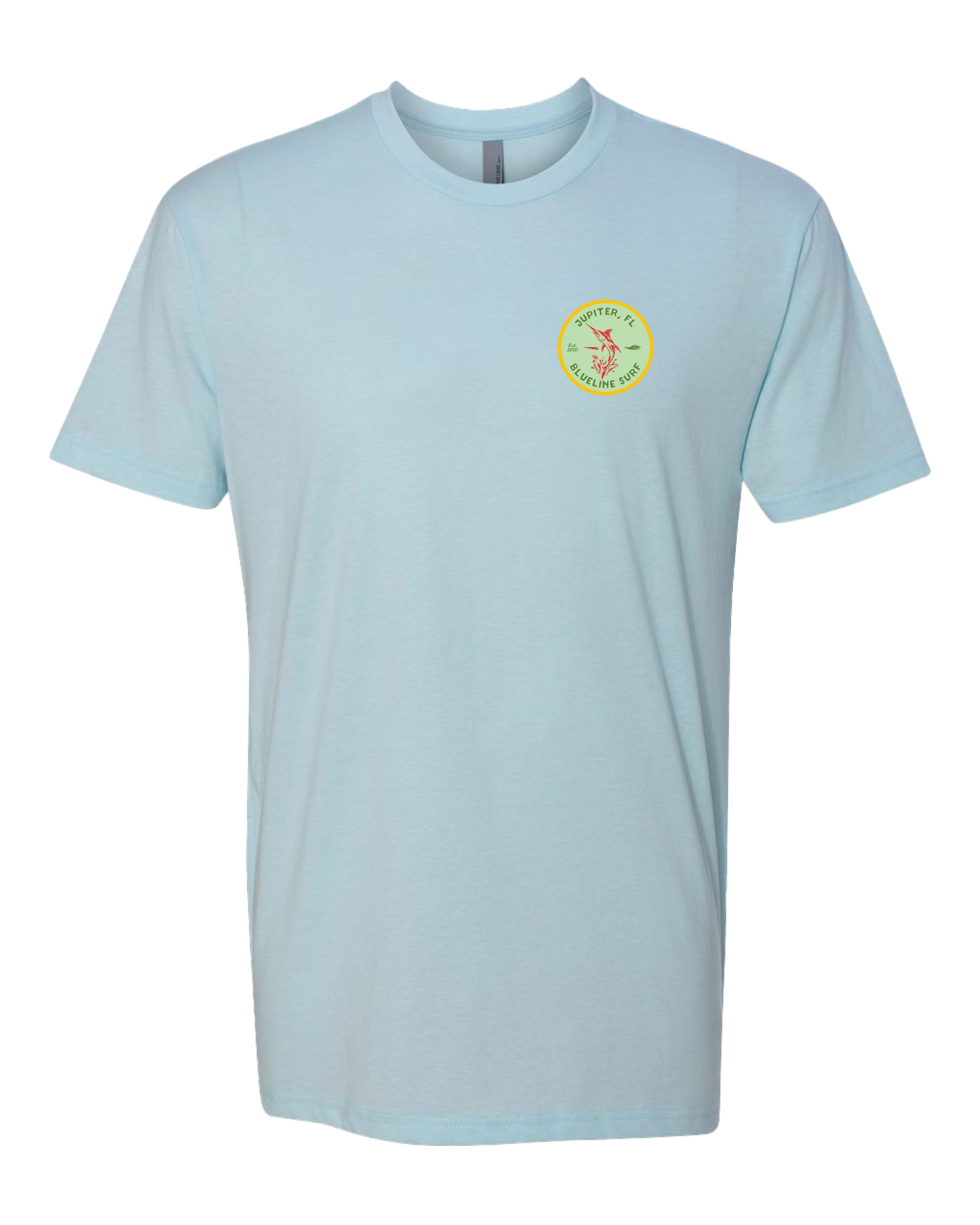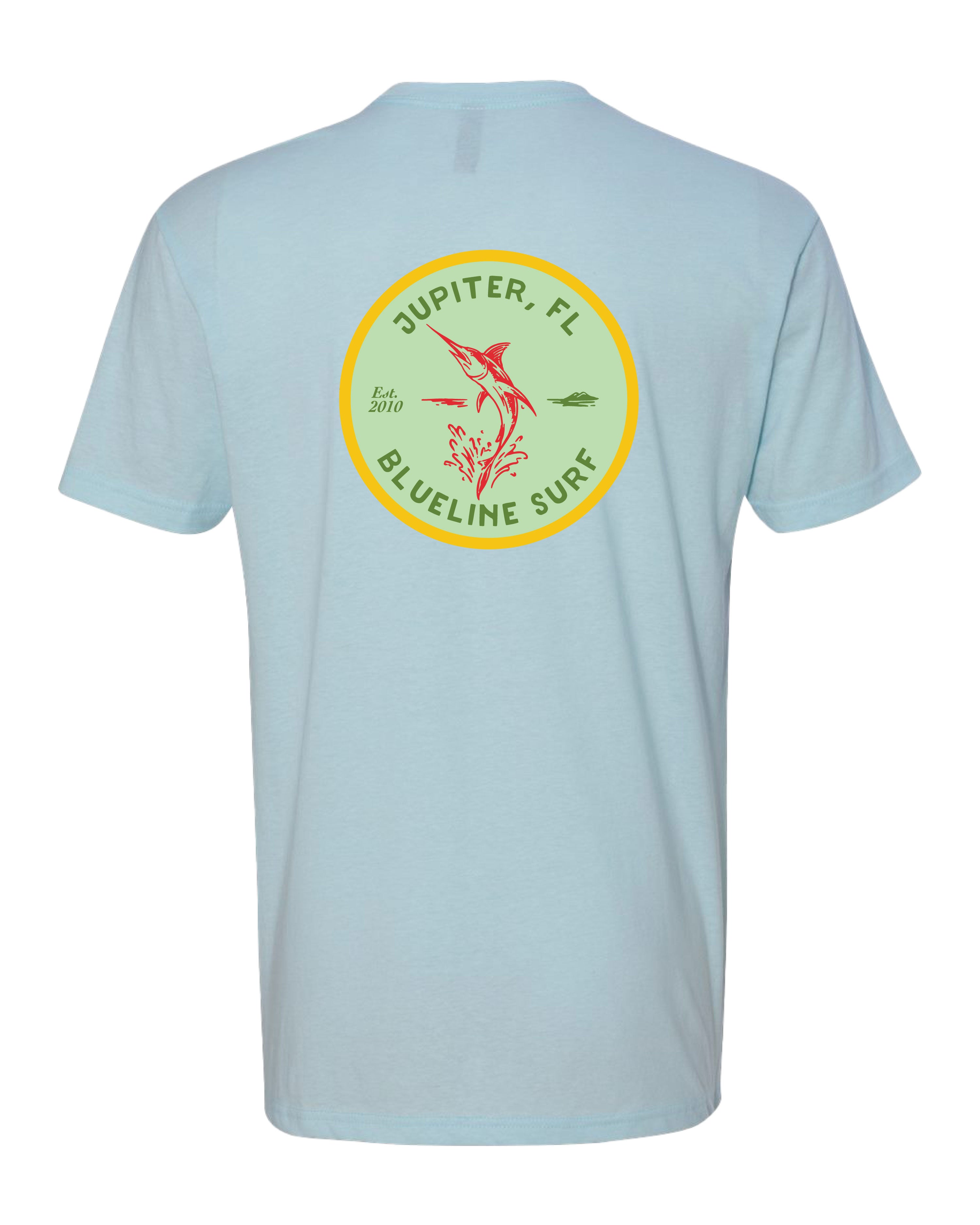 This tee features the Blueline Surf & Paddle Co. circular logo in avocado green and yellow, showcasing a marlin mid-jump with Jupiter, FL proudly printed across the top. The ice blue cotton fabric delivers an easy, breathable feel that fits right in at the sandbar, on the dock, or around town.