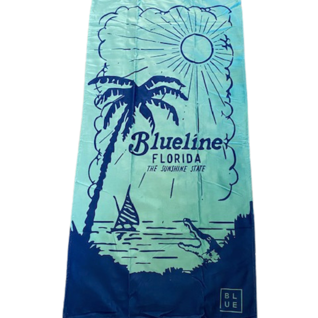Sun, salt, and Florida state of mind. The Blueline Sunshine State Beach Towel celebrates everything that makes coastal living legendary. Featuring palm trees, ocean icons, and bold Sunshine State graphics alongside Blueline Surf & Paddle Co. branding, this oversized towel brings laid-back Florida vibes wherever you land.
