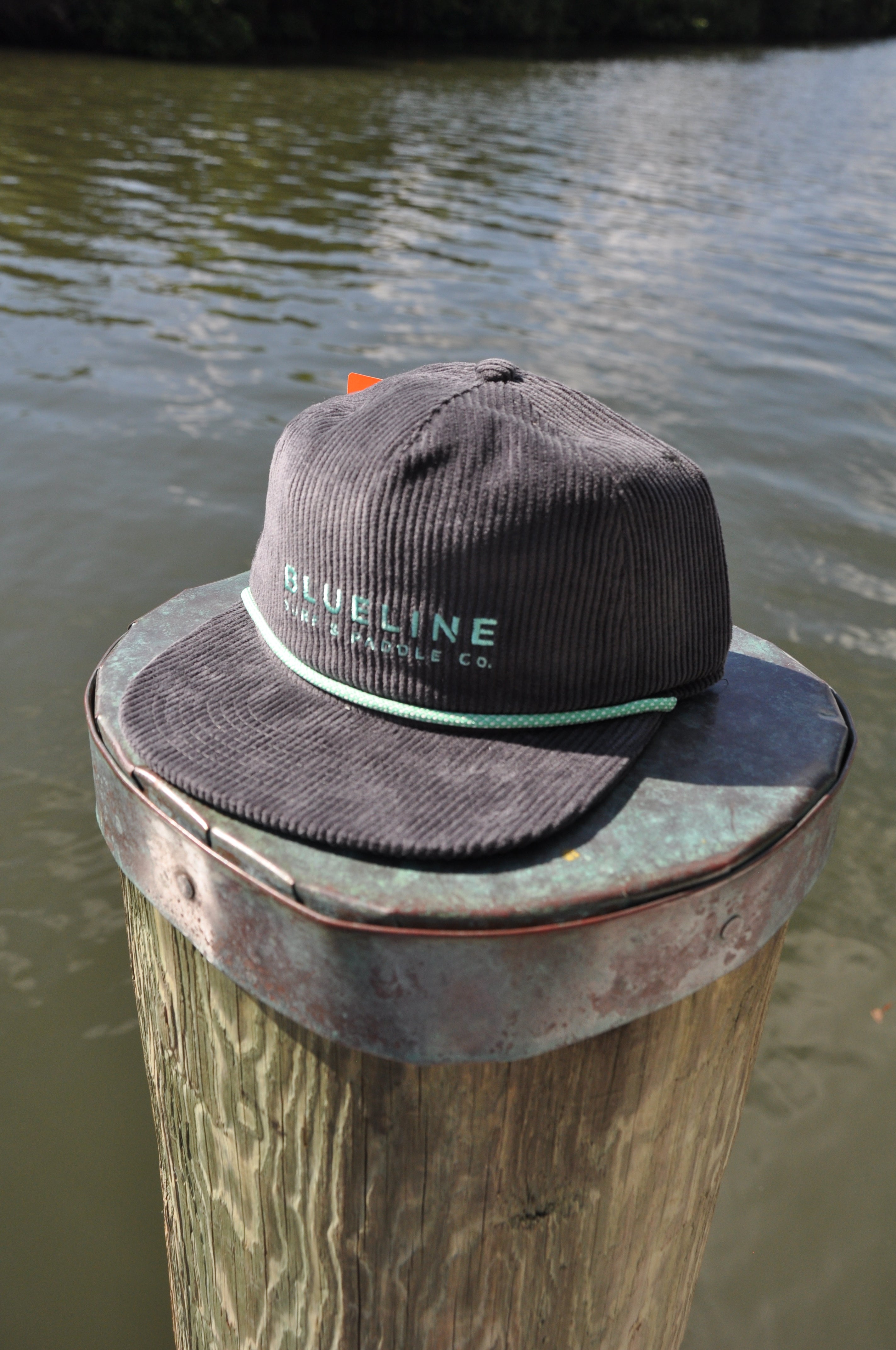 The Classic Blueline Cord Hat in charcoal delivers a clean, understated look with seafoam embroidery and matching rope accent across the bill.