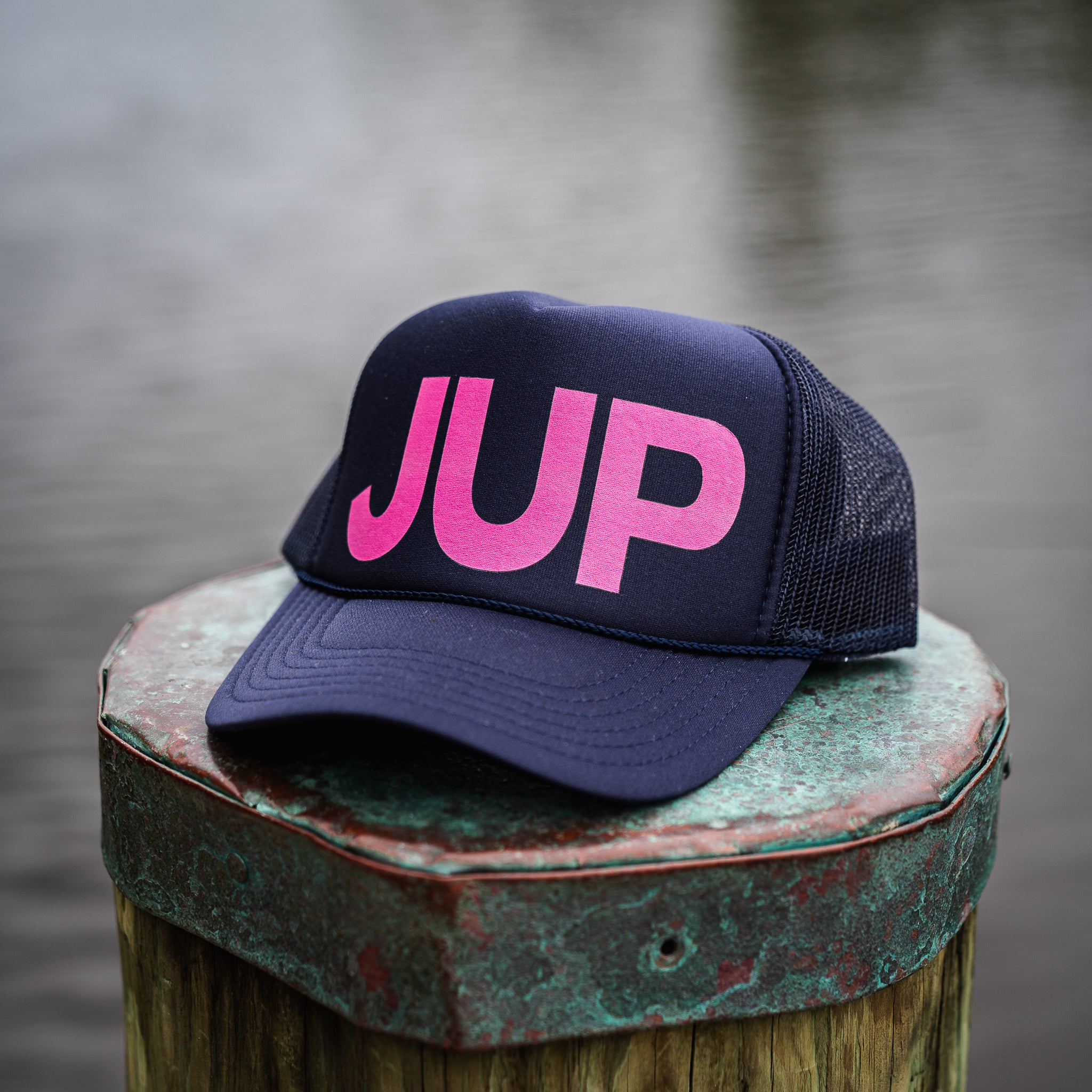 This breathable mesh-back hat features the iconic JUP lettering in vibrant pink, representing the heart of the Jupiter lifestyle. Boat days, Sandbar celebrations and wearing around the house.