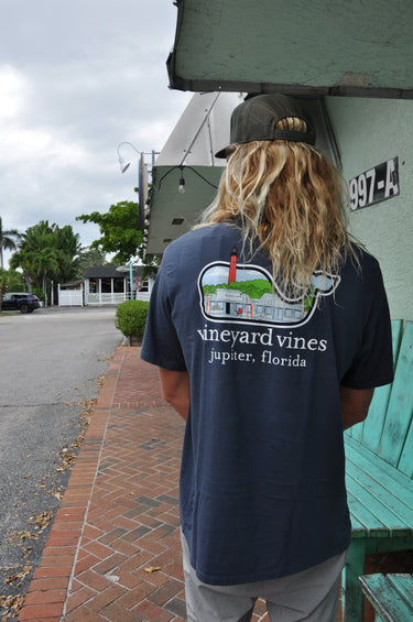 Where New England classics meet Jupiter style. The Vineyard Vines x Blueline Storefront Lighthouse T-Shirt blends the iconic Vineyard Vines whale with our Blueline Surf & Paddle Co. storefront and the Jupiter Lighthouse.