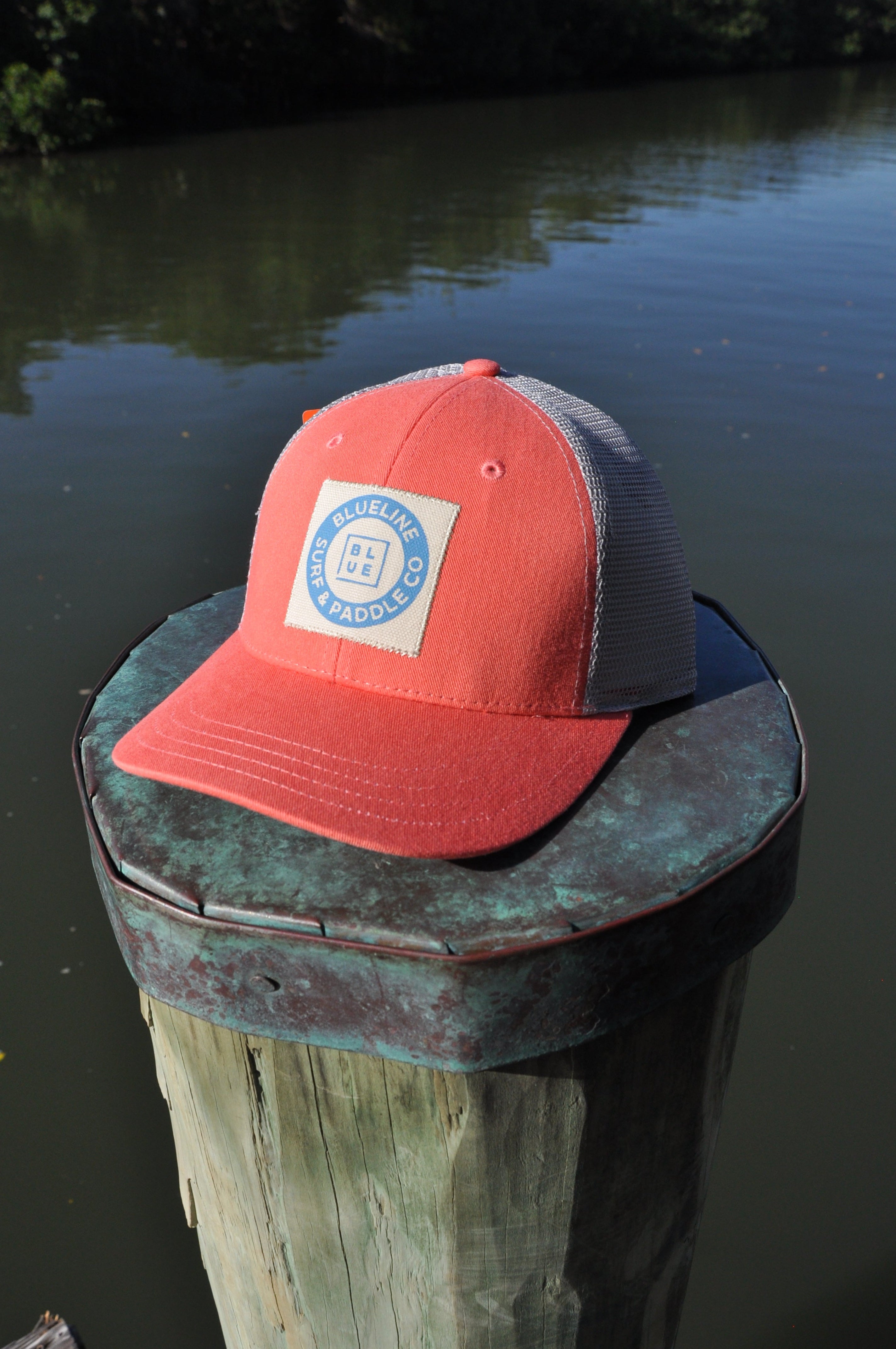 The Vintage Circle Square Hat in mango and steel features a bold electric blue Blueline patch front and breathable mesh back for classic trucker comfort.