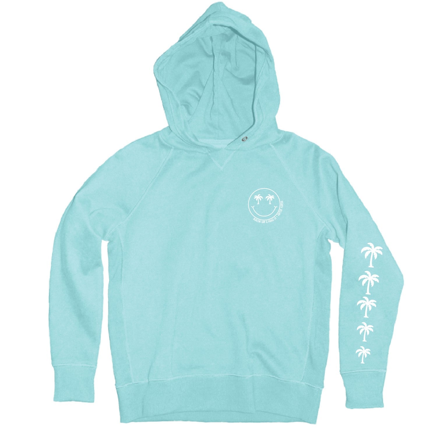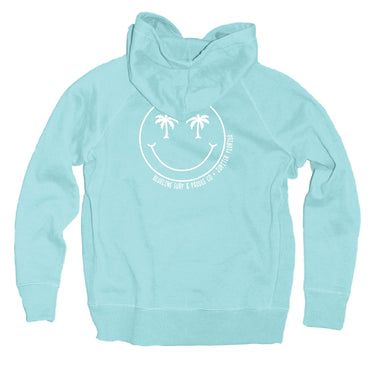 Featuring a bold smiley back graphic with palm trees, a clean front chest hit, and palm tree details down the sleeve, this hoodie blends fun style with everyday comfort. Made in collaboration with Blue 84, it’s lightweight enough for Florida weather while still cozy for breezy mornings and cool evenings.